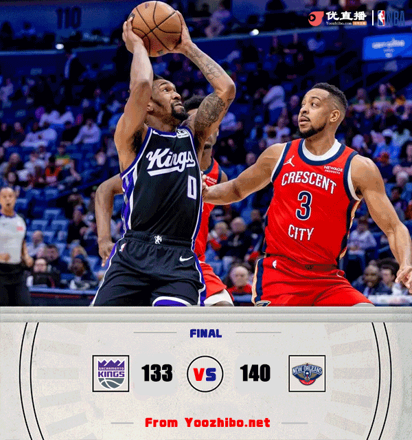 直播车讯2月14日 NBA常规赛,国王对阵鹈鹕,国王最近打得不错取得3连胜,鹈鹕则是10连败在西部垫底,本场比赛锡安缺阵。开场后两队就打得大开大合,鹈鹕手感不错率先取得领先,国王大量尝试外线三分,他们靠着不错的三分命中率将比分追上,第一节尾声国王连续断球反击将比分反超。第二节上来鹈鹕先冲击内线夺回领先,随后两队陷入僵持,场上比分也是交替上升,拉文单节得分上双帮助国王在半场结束前保住优势。易边再战,麦科勒姆突然爆发,他第三节单节轰下21分帮助鹈鹕将比分反超。第四节上来鹈鹕一度扩大领先优势,厄尔三分弹无虚发,但萨博尼斯和德罗赞联手帮助国王将比分追上,但关键时刻德罗赞连续进攻不中,麦科勒姆关键抛投打进,蒙克拿到关键前场篮板造成布朗犯规,随后两罚全中拖入加时。加时赛中麦科勒姆手感火热接连砍分帮助鹈鹕拿下胜利,最终鹈鹕加时140-133力克国王结束10连败,国王3连胜被终结。