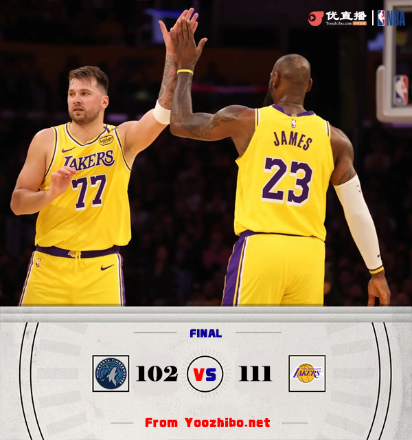 直播车讯2月28日讯 NBA常规赛,湖人主场迎战森林狼。湖人3连胜后35胜21负西部第5位,森林狼32胜27负西部第8位。本场比赛,迪文岑佐迎来复出,戈贝尔和兰德尔继续不打。比赛开始,东契奇上来又攻又传带队打出11-3开局,森林狼依靠外线止血,但东契奇里突外投继续得分,詹姆斯也接连外线发炮,二人皆得分上双,首节湖人就建立16分领先,次节湖人外线多点开花连中4记三分直接领先到20分以上,森林狼连续攻击内线8-1止血,爱德华兹和香农接连三分半场追到差11分。下半场,湖人上来10-2再次拉开比分,爱德华兹带队迅速回应10-3止血后再吃T被驱逐,八村塁也伤退,森林狼接连三分能回应,但詹姆斯攻防发力助湖人稳住11分领先,末节香农继续奇兵角色,森林狼轰出11-0一度追到差3分,东契奇强突2+0后神奇压哨三分稳住局势,最终湖人拒绝逆转,111-102力克森林狼,拿到4连胜。