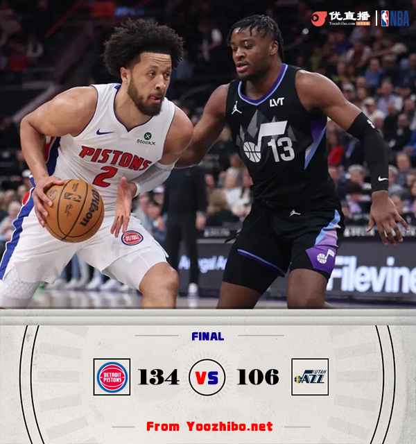 直播车讯北京时间3月4日讯 NBA常规赛,活塞对阵爵士,活塞上场比赛轻取篮网稳居东部第六,爵士继续在西部垫底,上场输给鹈鹕。刚开场爵士在进攻端还打得有声有色,一度和活塞打得有来有回,但第一节后半段爵士失误开始增多,活塞多点开花迅速拉开比分,第一节爵士出现10次失误。第二节回来两队都先是选择冲击内线拿分,康宁汉姆得分组织一把抓,带领活塞再度掀起一波攻势将分差拉大到20分以上。易边再战,活塞在康宁汉姆的带领下攻势依旧不减,爵士也是多点开花紧追不舍。最后一节,塞克斯顿和菲利波夫斯基联手继续发起反扑,康宁汉姆和奥萨尔重新登场后帮助活塞再度将分差拉大到20分开外,比赛彻底失去悬念,最终活塞134-106大胜拿下爵士取得2连胜,爵士遭遇2连败。