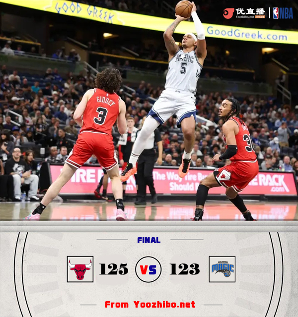 直播车讯北京时间3月7日讯 NBA常规赛,魔术主场迎战公牛。魔术4连败,以29胜34负排东部第8,公牛24胜38负东部第10。上半场,两队开场便陷入缠斗,比分始终紧咬,魔术轮番冲击内线屡屡暴扣,公牛多点开花给出回应,次节双方继续对攻,公牛全民皆兵,班凯罗连造杀伤还以颜色,半场战罢公牛69-66领先魔术3分。下半场,魔术轰出17-4一度取得两位数领先,公牛多点开花扳平比分,末节双方争夺陷入白热化,关键时刻怀特内外开花连得5分,班凯罗绝杀三分不中,公牛125-123魔术险胜过关。