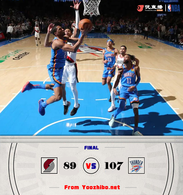直播车讯北京时间3月8日讯 NBA常规赛,雷霆对阵开拓者,雷霆最近5连胜依旧在西部遥遥领先,本场比赛亚历山大、杰伦威和霍姆格伦都缺阵,开拓者上场比赛遭遇失利,还是排在西部第十二。开场后雷霆外线手感不错频频命中三分,在第一节中段他们打出攻势取得领先,随后开拓者也用三分回击缩小分差。第二节上来西蒙斯率先发力带领开拓者反超比分,雷霆通过加强防守多次造成开拓者失误打出反击,并且外线续上火力重新夺回领先,第二节尾声开拓者陷入得分荒,半场过后雷霆领先到18分。易边再战,雷霆上来延续攻势将分差拉大到20分开外,亨德森突然爆发带领开拓者一路追到只差5分。第四节雷霆及时稳住局面,两队围绕10分拉锯,开拓始终无法追上比分,最终雷霆107-89击败开拓者取得6连胜,开拓者遭遇2连败。