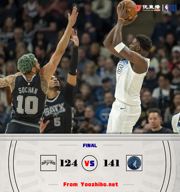 直播车讯北京时间3月10日讯 NBA常规赛,森林狼主场迎战马刺。森林狼4连胜后36胜29负西部第7,马刺则是26胜35负西部第13。本场比赛,戈贝尔迎来复出。比赛开始,马刺开场慢热,麦克丹尼尔斯帮助球队打出不错开局,福克斯和瓦塞尔内外线接连止血回应,爱德华兹接连三分命中单节上双,森林狼首节领先8分,次节双方展开对攻战,康利连续三分命中,卡斯尔接连突破回应,里德和福克斯也在外线对飚,双方次节打成31平。下半场,双方继续对攻,马刺多点开花追分,爱德华兹接连突破回应,分差始终保持在10分左右,末段森林狼连续3记三分拉开15分领先,末节森林狼继续发力,戈贝尔接连内线吃饼拉开20分以上领先,随后双方逐渐换上替补练兵,最终森林狼141-124击退马刺,拿到5连胜。
