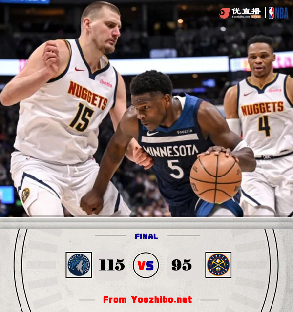 直播车讯北京时间3月13日讯 NBA常规赛今日继续开打,西部第二的掘金今日坐镇主场迎战西部第七的森林狼,本赛季两支球队交手两次,森林狼两战全胜占据上风。首节开局森林狼反客为主以一波14-4的攻势抢占先机,早早进入状态的他们手感保持一整节,他们首节以50%的命中率并命中5记三分打得掘金毫无办法,后者除了约基奇超强实力砍下15分外大部分人都发挥失常;次节森林狼状态有所回落但掘金也没能抓住机会,双方前5分钟里都只拿到9分;后半段双方相继回暖但森林狼一直占据上风并带着9分优势进入下半场。休息归来森林狼依旧稳定输出一直保持着10分左右的领先;掘金防守端糟糕的发挥导致了约基奇三节31分都无力扭转局面;末节兰德尔和里德相继命中三分将优势拉大至20分以上早早奠定胜局。最终,森林狼客场再胜掘金,目前三次交手三杀对手。