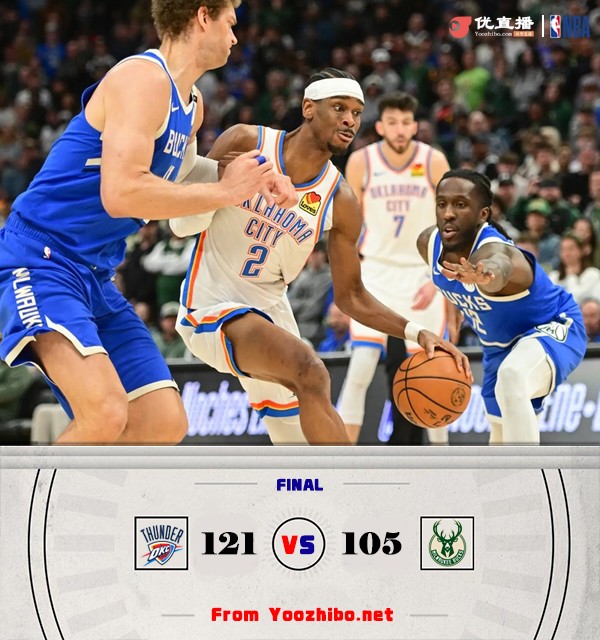 直播车讯北京时间3月17日讯 NBA常规赛,雷霆对阵雄鹿,雷霆最近取得2连胜稳居西部榜首,雄鹿最近也是拿到2连胜。开场后两队你来我往就打得相当激烈,雷霆一度连得6分取得领先,特伦特替补登场后联合利拉德打出攻势在首节结束帮助雄鹿反超比分。第二节上来乔和哈尔滕施泰因内外联手帮助雷霆打出攻势夺回领先,雄鹿进攻主要靠利拉德和字母哥两人发挥,亚历山大接连砍分回应带领雷霆将分差拉大到两位数。易边再战,雷霆延续攻势继续扩大领先,雄鹿多点开花努力追分,但雷霆始终保持稳定的发挥,最后一节字母哥带队虽然略微缩小一些分差,但分差还是维持在两位数,最终雷霆121-105轻松击败雄鹿取得3连胜。