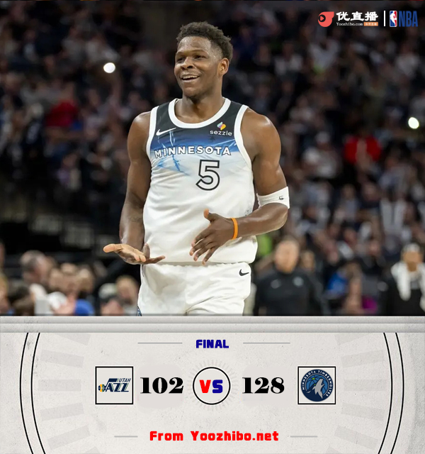 直播车讯北京时间3月17日讯 NBA常规赛,森林狼主场迎战爵士。森林狼目前7连胜,39胜29负排在西部第7位;爵士则是8连败后15胜52负西部垫底。本场比赛,康利不打。比赛开始,爱德华兹状态出色,里突外投连砍10分带队轰出17-5不错开局,马尔卡宁接连三分止血,爱德华兹进攻挡不住单节轰下21分带队首节领先14分,次节爵士上来12-2直接咬住比分,森林狼迅速调整,多点开花回应12-2稳住领先优势,半场森林狼还领先11分。第三节,塞克斯顿带队追分,但爱德华兹再次发力,单节又轰下16分,森林狼直接拉开20分以上领先,末节森林狼换上替补练兵,克拉克攻防带队拉开30分以上领先,爵士无力回天,最终森林狼128-102大胜爵士,豪取8连胜同时送对手9连败。