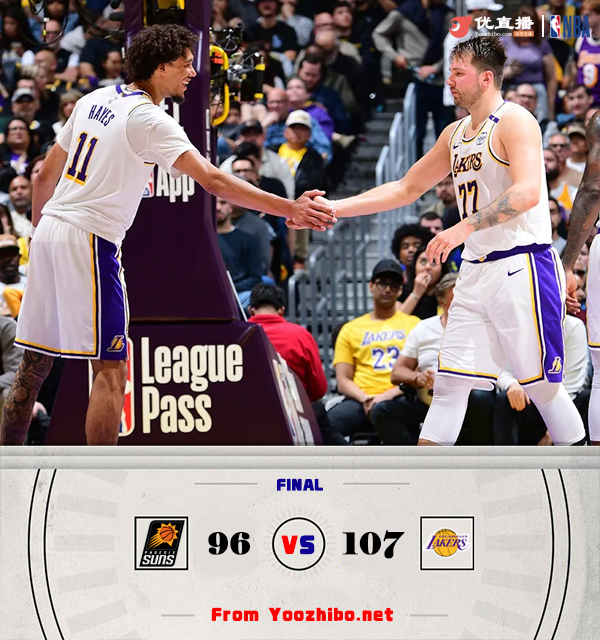 直播车讯3月17日NBA常规赛,湖人主场迎战太阳。湖人已经经历4连败,目前40胜25负西部第5位;太阳则是31胜36负西部第11位。本场比赛是湖人5天4赛中的第3场比赛,海斯、芬尼-史密斯迎来复出;詹姆斯继续缺阵。比赛开始,湖人上来打出7-0不错开局,太阳迅速回应9-1反超,随后东契奇连续外线发炮带队建立主动权,文森特三分再中一度拉开20分领先,次节双方展开拉锯战,太阳三巨头状态不佳,外线颗粒无收,里夫斯接连中远投命中,海斯继续吃饼,半场湖人还领先17分。下半场,比尔因腿筋伤退,杜兰特连续中远投砍下8分带队一度追到个位数分差,东契奇又是送妙传止血后连续杀伤内线稳住领先优势,三节湖人还领先12分,末节双方命中率都有下降,里夫斯3+1后东契奇再打2+1帮助湖人牢牢守住双位数领先,最终湖人107-96击退太阳,终止4连败。