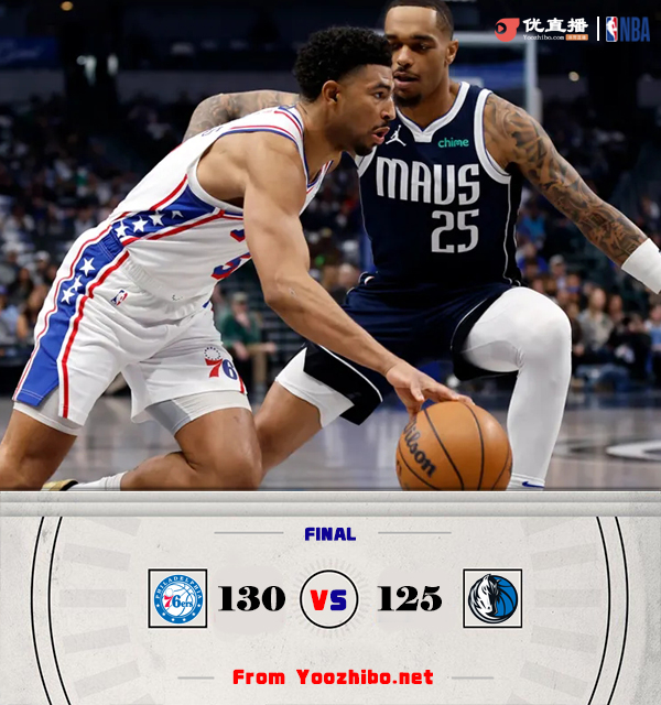 直播车讯3月17日讯 NBA常规赛激战正酣,独行侠主场迎战76人,两队本赛季均遭遇伤病潮,76人遭遇3连败,22胜44负位列东部第12位,独行侠连败后战绩来到33胜35负,排在西部第10位。此役一上来格莱姆斯联手亚布塞莱不断取分,席菲诺替补登场连中三分,华盛顿连造杀伤单节14分及时止血,首节结束时76人领先4分,次节回来,独行侠众将找到进攻感觉,多点开花的他们一举反超,半场战罢,独行侠后来居上领先4分。易边再战后双方你来我往火热对攻,格莱姆斯延续火力予取予求,三节结束后76人反超确立12分优势,末节上来,丁威迪联手克莱率队追分,决胜时刻丁威迪仓促绝平未果,76人连中罚球后独行侠回天乏术,最终76人130-125力克对手。
