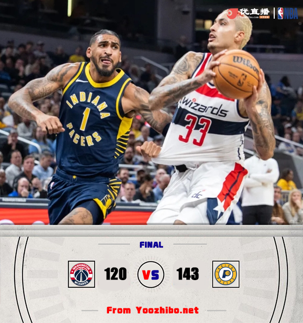 直播车10月26日讯 NBA常规赛,奇才客场挑战步行者。上半场,奇才率先发力占据主动,步行者连中三分迅速回应,奇才持续发力打出12-3的攻击波,步行者多点开花还以颜色,次节步行者利用防守反击完成反超,布鲁斯-布朗和希尔德相继飙中三分,半场战罢步行者73-68领先奇才。易边再战,奇才命中率骤降,步行者稳扎稳打不断扩大领先,末节奇才仍无起色,步行者持续发力将分差拉开到20分以上,在还剩半节多的时间里奇才换下主力投子认负,最终,步行者主场143-120大胜奇才。