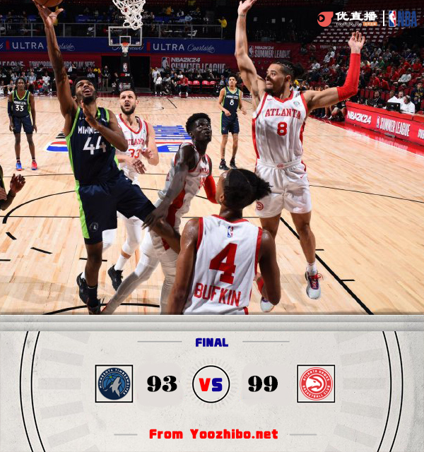 直播车讯 7月13日讯 NBA夏季联赛,老鹰对阵森林狼。一开场,森林狼率先发力,连造杀伤开局9-2领先,老鹰轮番冲击篮筐拿分追赶,并且完成7-0的攻势反超比分,森林狼命中率持续下降,老鹰连中4记三分取得两位数优势,半场战罢老鹰50-40领先10分。下半场,双方围绕两位数的分差展开拉锯战,老鹰突然哑火,森林狼火力全开轰出24-7的进攻狂潮,此后老鹰及时回暖完成12-2的攻击波重夺领先,关键时刻泰瑞斯-马丁连投带罚拿到6分,老鹰虽连续罚球失手,但森林狼没能抓住机会。最终,老鹰99-93力擒森林狼。