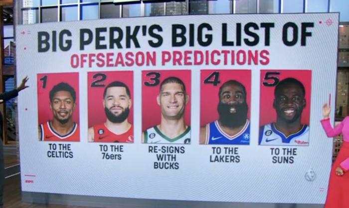 疯狂的休赛期来了,前NBA球员、现任ESPN评论员的帕金森预测今年休赛期五大交易——奇才球星比尔前往凯尔特人,猛龙核心范弗利特加盟76人,雄鹿中锋大洛佩兹将会和雄鹿续约;76人球星哈登加盟湖人,勇士球星格林加盟太阳。