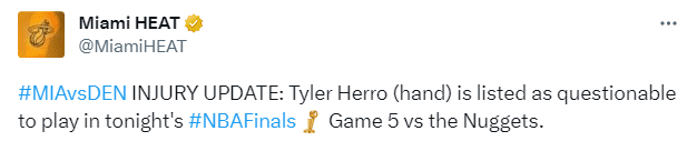 总决赛G5大战前,热火官方先是把希罗(手部骨折)的出战状态升级为出战成疑,50%可能性复出,经过赛前热身之后,热火方面确认,希罗回归出战总决赛生死战。