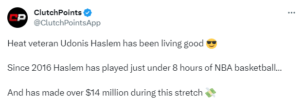 来源:直播车06-12 15:40直播车06月12日美媒晒出热火43岁老将哈斯勒姆近年来的收入情况,7年出战不到8小时狂赚1400万美元,美媒Clutch Points配文写道:热火老将哈斯勒姆一直活得很滋润,自2016年以来,哈斯勒姆的NBA出场时间不足8小时,期间他挣得了超过1400万美元的薪水。