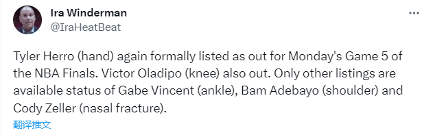 来源:直播车06-12 10:52直播车06月12日,热火官方公布总决赛G5伤情,希罗(手部骨折)和奥拉迪波(膝伤)都因伤缺席生死战,文森特(脚踝)、阿德巴约(肩膀)和泽勒(鼻骨骨折)都可以出战;预计掘金全队都可以出战,约基奇的脚踝伤势无大碍,穆雷(手掌擦伤)则继续带伤出战。