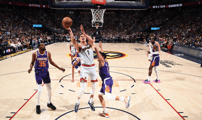 首节比赛主场作战的掘金火力全开,进攻势头很强,同时防守到位。波特单节轰进4记三分球,戈登的进攻效率也很高,他们站出来帮助约基奇分担压力,掘金一度领先太阳15分,第一节结束时领先11分。掘金对于太阳外线的限制很好,防守到位,期间还有艾顿被迫出来接球,在约基奇的硬扛下,直接跳回后场被吹回场违例。