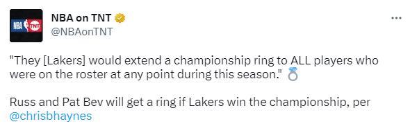 来源:直播车05-09 09:48直播车05月09日,据名记Chris Haynes报道,湖人总经理佩林卡已经确认,若湖人本赛季夺冠,他们将为本赛季在任何时刻效力过球队的球员颁发总冠军戒指,这意味着若湖人夺冠,威少和贝弗利等湖人旧将都能收到湖人的总冠军戒指。