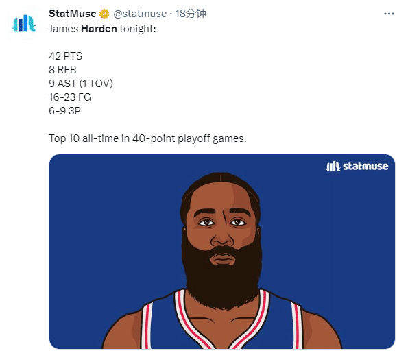 2、哈登42分创76人生涯季后赛得分第二高纪录