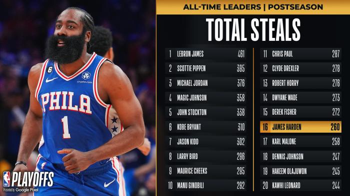7、哈登季后赛抢断数超越卡尔-马龙升到历史第16位