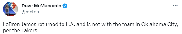 来源:直播车03-02 10:12直播车讯03月02日,詹姆斯、浓眉和拉塞尔三大主力都因伤缺战雷霆,据报道,詹姆斯已经提前返回洛杉矶,暂时离开球队,未随队前往俄城。