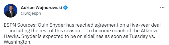 斯奈德曾担任过湖人、快船、76人等队助教,2014年开始担任爵士主帅,执教爵士长达8年,常规赛执教战绩是372胜264负,成为爵士历史上胜场数第二多的主教练;本赛季剩余时间,斯奈德将执教特雷-杨和穆雷,全力冲击季后赛。