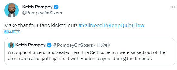 据费城记者Keith Pompey报道,第三节期间,坐在凯尔特人替补席附近的76人球迷和绿军球员发生冲突,总共4位球迷被赶出球馆。