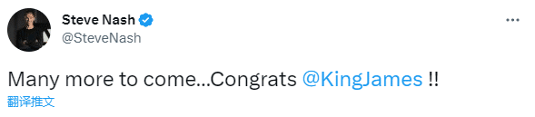 纳什发推祝贺詹姆斯:还有更多(伟大去成就),恭喜詹姆斯;保罗也更新社媒祝贺老詹,不过詹姆斯未来不可能超越斯托克顿成为历史助攻王。