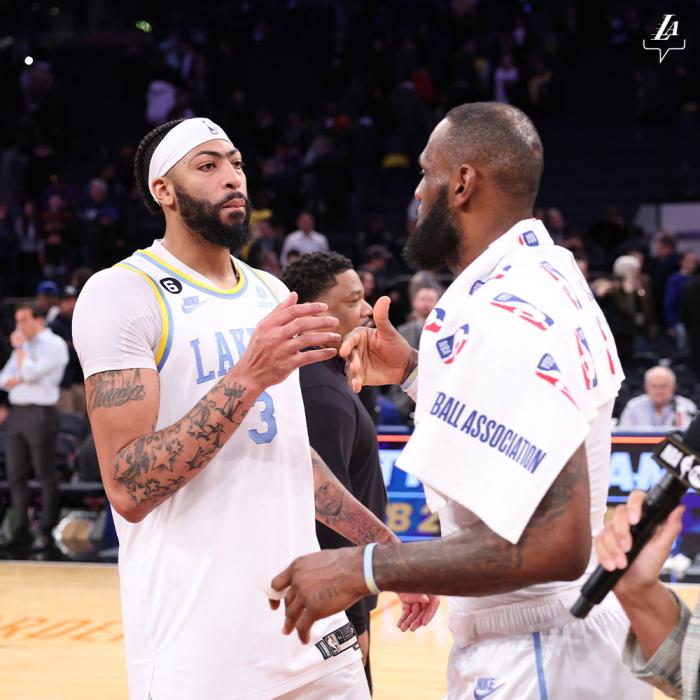 赛后詹姆斯拥抱兰德尔,然后和浓眉一起庆祝胜利。