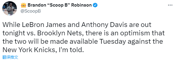 来源:直播车01-31 16:01直播车01月31日讯 ,据名记Brandon Robinson报道,詹姆斯和浓眉预计将会出战下一场与尼克斯的比赛;换言之,詹眉都不会缺席很久,预计明天复出战尼克斯;此前哈姆曾表示浓眉休战是湖人计划内的事,詹姆斯则是因脚特别酸痛才休战的。
