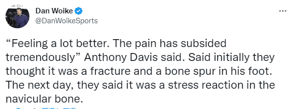 浓眉本人表示:现在感觉好多了,疼痛已经大大减轻了,伤势正在迅速愈合;浓眉还透露最初队医说他们认为这是他的脚骨折和有骨刺。第二天,他们说这是右脚骨头的压力反应。