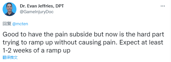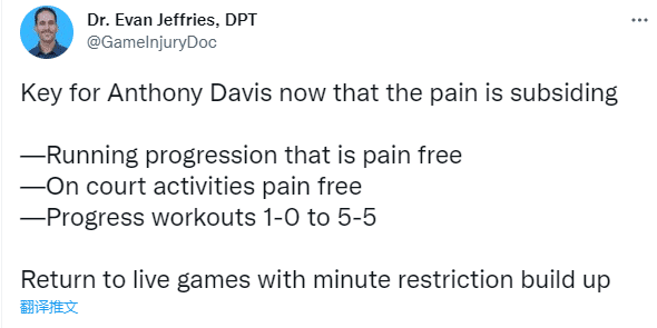 医学专家Evan Jeffries表示浓眉的右脚疼痛正在消退,复出前浓眉需要跑步时感受不到疼痛,在球场上训练时无痛,训练从单独训练到5对5训练,复出后受到出场时间的限制,预计还需要1-2周才能回归。