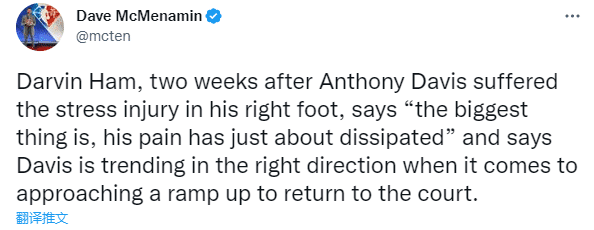 对于浓眉的伤情,哈姆表示:现在戴维斯的疼痛感几乎消失了,他正在朝着正确的方向发展,他正在接近于重返球场。