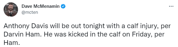 湖人巨头又添新伤:浓眉左小腿被踢伤确定休战 詹姆斯出战背靠背