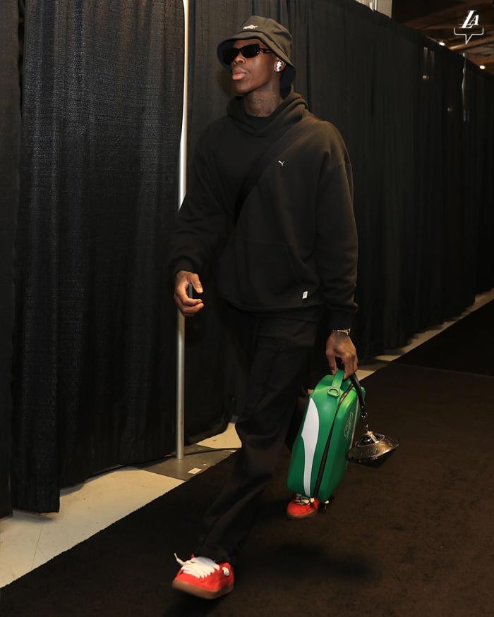 湖人再次对阵马刺,詹姆斯(左内收肌拉伤)带伤出战背靠背的比赛,贝弗利(禁赛)继续缺席;赛前入场时,詹姆斯身穿红色连帽卫衣并且戴着两顶帽子出镜,威少双手比V满脸笑容,浓眉提着包包则是表情严肃。