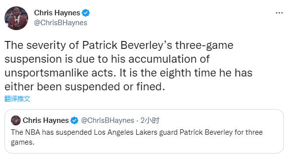 为何贝弗利会被禁赛三场?名记Chris-Haynes表示:贝弗利之所以被停赛三场,原因是他不断积累的不符合体育道德的行为,这是他第八次被禁赛或罚款。