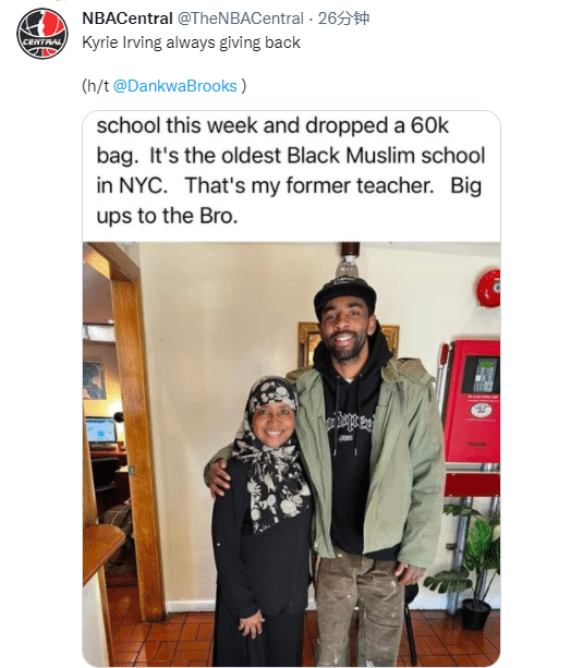 据篮网媒体Nets Nation透露,有网友盛赞欧文的善举:欧文这周来到我的小学/初中,并且捐赠了6万美元。这是纽约最老的黑人穆斯林学校,照片里和他合影的是我以前的老师,要给这位兄弟比个大拇指!