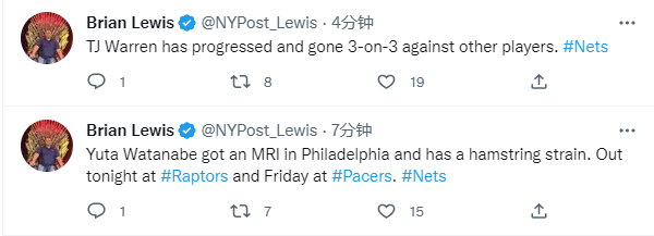 来源:直播车11-24 16:01直播车11月24日,篮网队的最新伤情曝光,据篮网记者Brain lewis报道,渡边雄太的核磁检查结果显示,他的腿筋拉伤,因伤至少再缺席2场比赛;篮网新援TJ-沃伦已经参加三对三比赛,