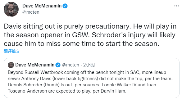湖人跟队记者Jovan buha表示他相信威少不会在新赛季揭幕战首发出战;换言之,名记认为湖人揭幕战大战勇士,预计威少将替补出战。
