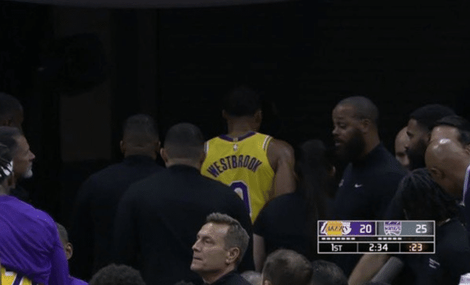 今日季前赛收官战,浓眉、施罗德和朗尼-沃克都缺席比赛,詹姆斯、贝弗利带队首发出战,威少时隔14年再次替补登场;首节湖人23-36落后国王13分,湖人落后还有坏消息,威少仅打5分钟便不幸受伤,初步确诊为左腿筋受伤,因伤提前退出比赛。
