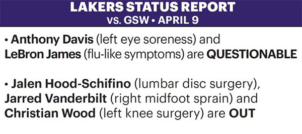 来源:直播车04-09 11:02直播车讯 北京时间4月9日,湖人和勇士关键卡位战的伤病报告出炉,詹姆斯生病和浓眉左眼酸痛都是可能出战,湖人三将继续伤停;勇士队库里轮休一场后将回归,维金斯大概率复出。