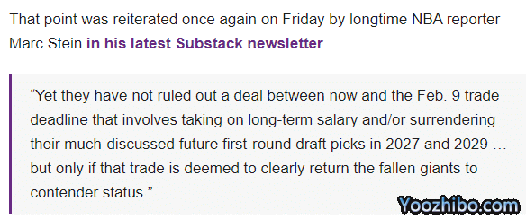 Marc Stein重申,湖人还没有排除从现在到2月10日交易截止日期之间达成一项交易威少的协议,该协议涉及到湖人接受长期薪酬以及送走他们手中的2027年和2029年首轮选秀权,不过该交易的前提是能让湖人重新加入争冠的行列之中。