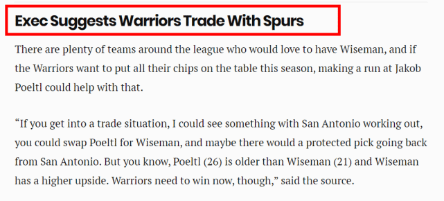 “勇士内部的一些人员正在评估年轻球员的表现,他们可能会交易其中一两个人,以便更有实力卫冕总冠军。”一位西部高管表示,“怀斯曼是这份名单上排名最靠前的那个人,因为有球队仍对他有兴趣,想知道作为一位有投射有防守的大个子,他的潜力能有多大的开发。”