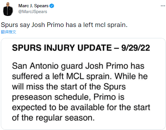 来源:直播车09-30 09:58直播车09月30日,马刺官方宣布,球队二年级后卫约什-普里莫在训练营中遭遇左膝内侧韧带扭伤,将至少缺席初段的季前赛,他的伤势并不算严重,马刺预计普里莫将在常规赛初期复出。