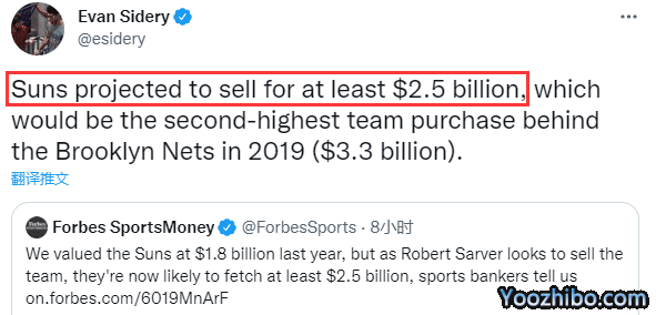 去年福布斯对太阳队的估值是18亿美元,据美记者Evan Sidery报道,现在太阳售价预计至少达到25亿美元,这将是仅次于2019年篮网(售价33亿美元)之后的第二高球队售价。