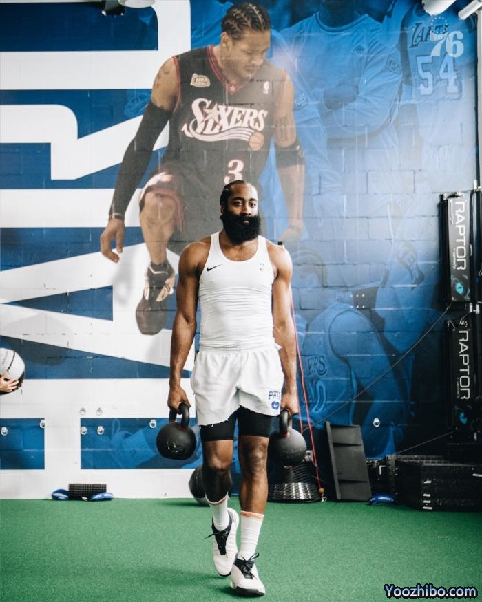 值得一提的是,此前76人官方晒出哈登最新训练照,撸铁苦练,大胡子身后的艾弗森海报十分抢镜。
