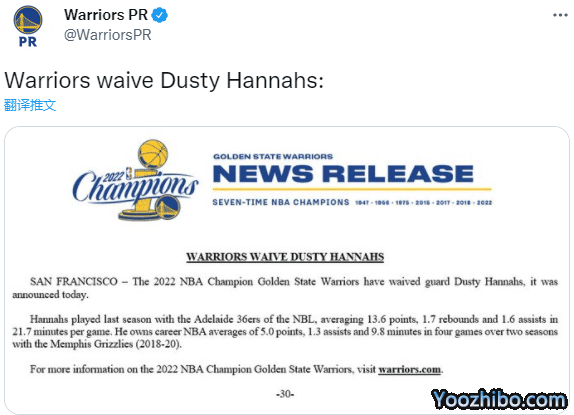 勇士裁掉汉纳斯,20人大名单缩减至19人:
