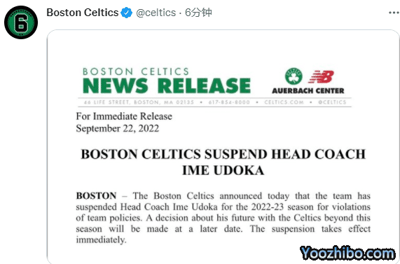 来源:直播车09-23 11:04直播车09月22日日,凯尔特人官方正式宣布,乌度卡因违反球队纪律,被球队禁赛整个2022-23赛季,禁赛立即生效;绿军主帅乌度卡因出轨女职员被停职一年,之后乌度卡公开道歉并且表示接受球队的处罚;乌度卡被禁赛整个赛季,乔-马祖拉将担任凯尔特人临时主帅。