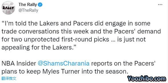 来源:直播车09-22 10:08直播车09月22日,湖人与步行者交易谈判失败,迈尔斯-特纳新赛季留守步行者;名记shams曝光谈判失败内幕,湖人拒绝送走两个首轮签,预计湖人保守进入新赛季;另外湖人有望很快引援神射博扬。
