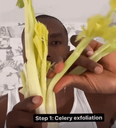 伊巴卡在视频中示范自己护理面部的步骤,看上来伊巴卡不但是篮球运动员,大厨,还是个美容师。他示范的第一步,是使用芹菜来去除面部的角质。