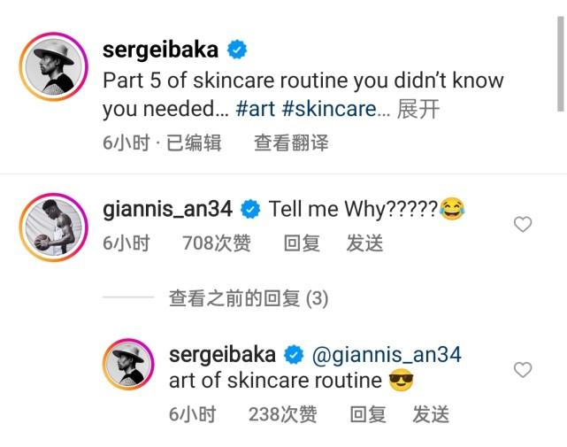 不得不说,伊巴卡真是一个精致的“猪猪男孩”。伊巴卡示范护肤步骤时,雄鹿队友字母哥出现在评论区,显然是已经被伊巴卡整懵了。字母哥留言道:“告诉我为什么要搞这些?(笑哭表情)”,伊巴卡回复道:“常规护肤的艺术。”
