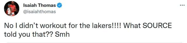 来源:直播车09-18 11:00直播车09月18日据NBA名记Michael Scotto报道,湖人试训了多位自由球员,其中包括沙巴兹-穆罕默德、杰里米-兰姆、德维恩-培根、米耶-奥尼、小托马斯、阿莫尼-布鲁克斯、沙里夫-库珀和米查尔-穆尔德。毫无疑问,两届全明星小托马斯是名气最大的球员,穆尔德是勇士旧将,兰姆的实力也很出色。小托马斯第一时间辟谣,表示自己并未为湖人试训。他写道:“不,我没有为湖人试训!!!哪个消息源告诉你的?”