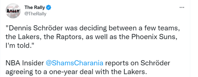 来源:直播车09-17 15:05直播车09月17日,名记Shams报道称,施罗德计划和湖人签下1年264万美元的合同,再次为这支球队效力,为此他拒绝了猛龙、太阳等队的邀请。施罗德本人也第一时间更新社媒,重回湖人后首次发声。名嘴Bill Simmons依然看衰湖人前景,认为得到施罗德湖人也只是西部9号种子。